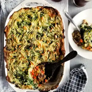 Colcannon, or Irish mashed potatoes, is baked over a hearty stew filled with veggies and seasoned tempeh swimming in a delicious mushroom stout gravy. Colcannon is traditionally made with cabbage, but spinach is what I had in my fridge when I created this recipe so that’s what I used and it turned out beautifully.