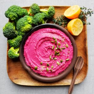 A gorgeous deep fuchsia tinted hummus that’s silky smooth with sweet, earthy tones. This hummus is perfect for dipping your favorite veggies or slathered on wraps, sandwiches and flatbread.