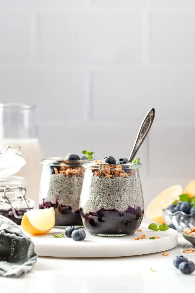 Another great make ahead breakfast option and addition to chia pudding is berry compote. Perfect for topping all the breakfast things like pancakes, waffles, smoothie bowls, etc. In this case, we’re layering the blueberry sauce with our lemon chia pudding for a delicious and nutritious combination!