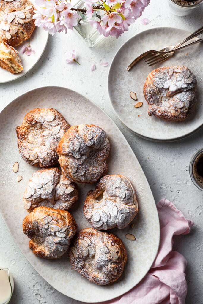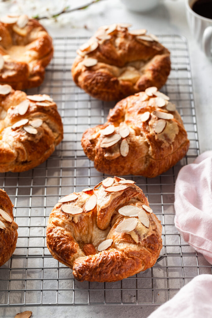 The almond custard filling can be made about 5 days ahead of time and kept in an airtight container in the refrigerator. It will firm up once chilled, so bring it to room temperature before you begin assembling the pastries so it’s easy to spread.