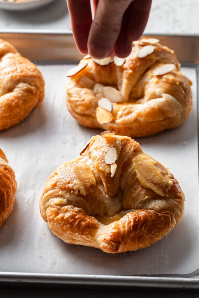 Sprinkled on top, sliced almonds provide a bit of added crunch and a pretty topping. Save a bit of the frangipane to spread over the top of each croissant for something for the sliced almonds to stick to.