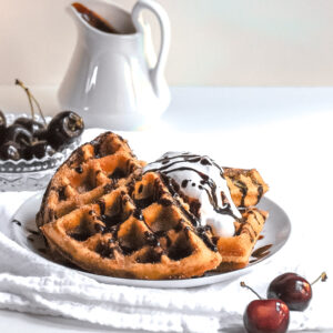 These waffles are pillowy soft inside, crisp on the outside and are lightly coated in cinnamon sugar. Served with chocolate sauce and whipped coconut cream, these waffles make for a special breakfast or, with coconut ice cream, a dreamy dessert!