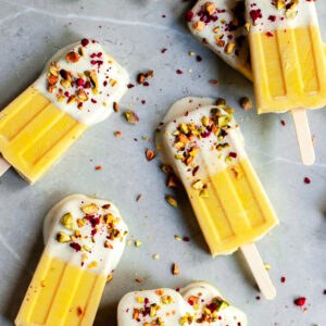 Loaded with fresh, sweet mango flavor and a touch of tartness from yogurt, the classic Mango Lassi goes dairy-free and then frozen into ice pops! With only 4 ingredients blended together, these vegan Mango Lassi Ice Pops are an easy and refreshing summer treat.