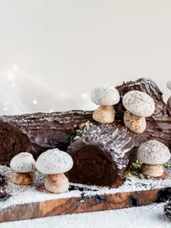 These cute little vegan meringues are made to look like mushrooms! Festive vegan meringue cookies are just like the egg-white based ones but are made with aquafaba instead! They are perfect for decorating a vegan Yule Log, or Bûche de Noël, for a fun and beautiful Christmas dessert.