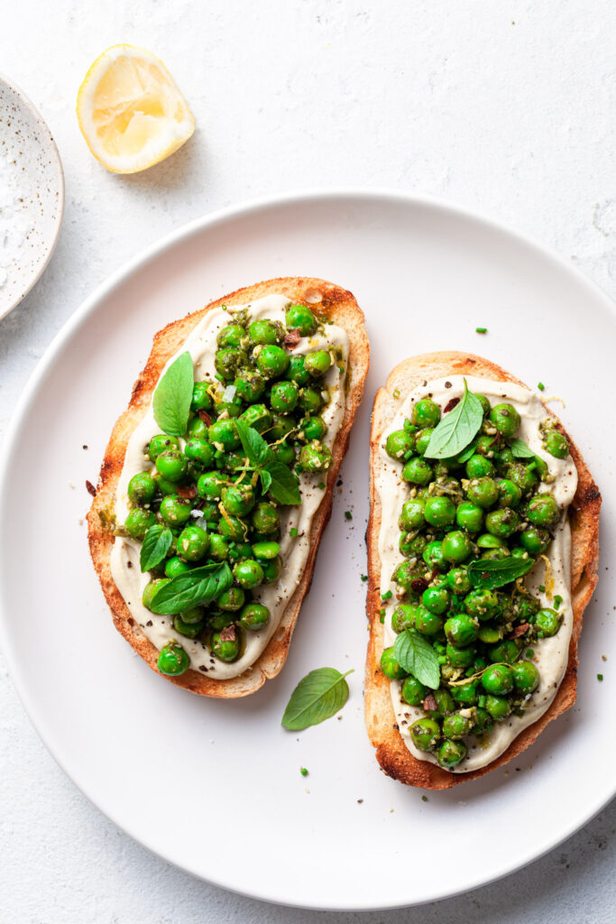 - Spread a thick layer of vegan ricotta on top of each slice of toast. Spoon the peas onto each toast, pressing lightly so that most of the peas stick to the cashew ricotta. Sprinkle with the garnishes if desired. Serve immediately. See Notes below for storing leftovers.