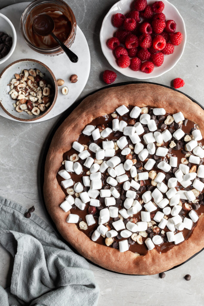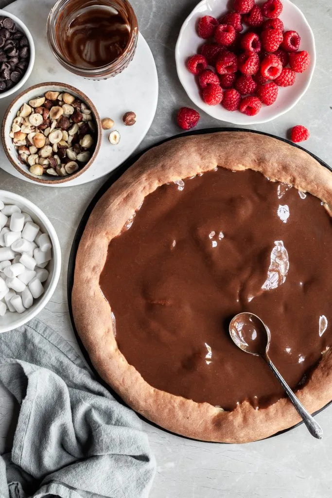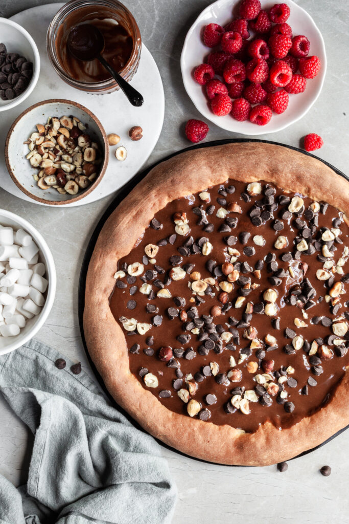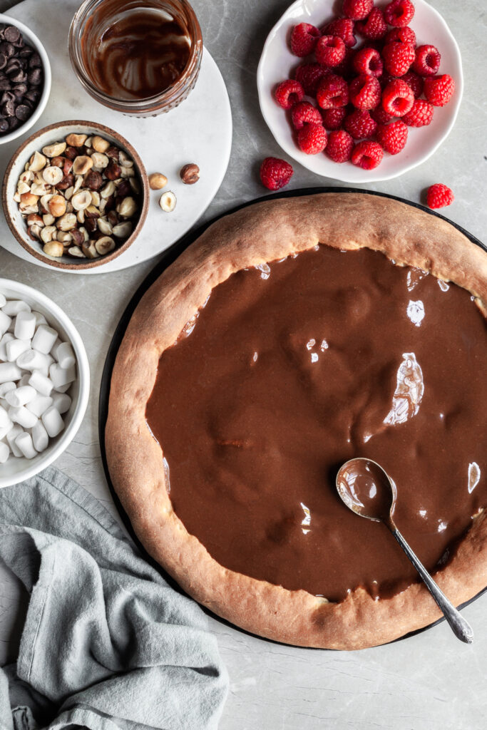 - Spread the vegan nutella over the top, leaving the 1" border untouched. Sprinkle with the chocolate chips, hazelnuts and vegan marshmallows. Return to oven, turning the broiler to high. Broil for 1-3 minutes depending on the oven, just until the marshmallows start to puff and brown. They will burn very easily, so keep an eye on them. Remove from the oven, sprinkle with raspberries if using and drizzle with warmed vegan nutella if desired. Enjoy!