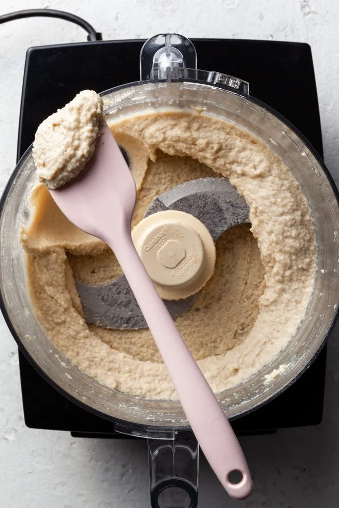 - Add all of the feta ingredients to a food processor and pulse until the mixture comes together but before it becomes completely smooth. The goal here is to still have a bit of texture from the cashews.