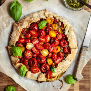 Creamy cashew cheese and a layer of pesto tucked under a blanket of roasted sweet cherry tomatoes all settled into a free-form, fuss-free flaky galette crust makes for an easy, pretty, and super delicious meal.