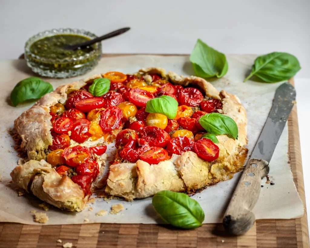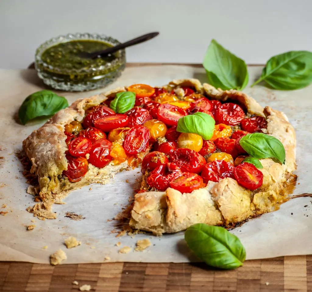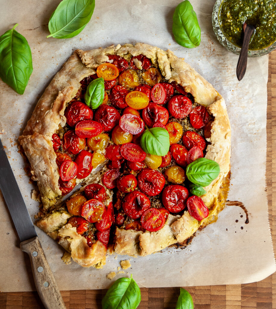 Vegan Cherry Tomato Galette with Pesto and Cashew Cheese