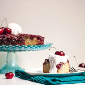 Upside down cakes are one of my favorite kinds of cakes to make – they always make such a statement with minimal effort. No layering or trimming, no frosting, and no waiting around for them to fully cool. In fact this cake is even better a bit warm. If you place it in the fridge and the coconut oil in the cherry layer solidifies, leave at room temperature if your kitchen is warm, or place the slices you need in the oven set to 350°F covered in foil for a few minutes or until warm.