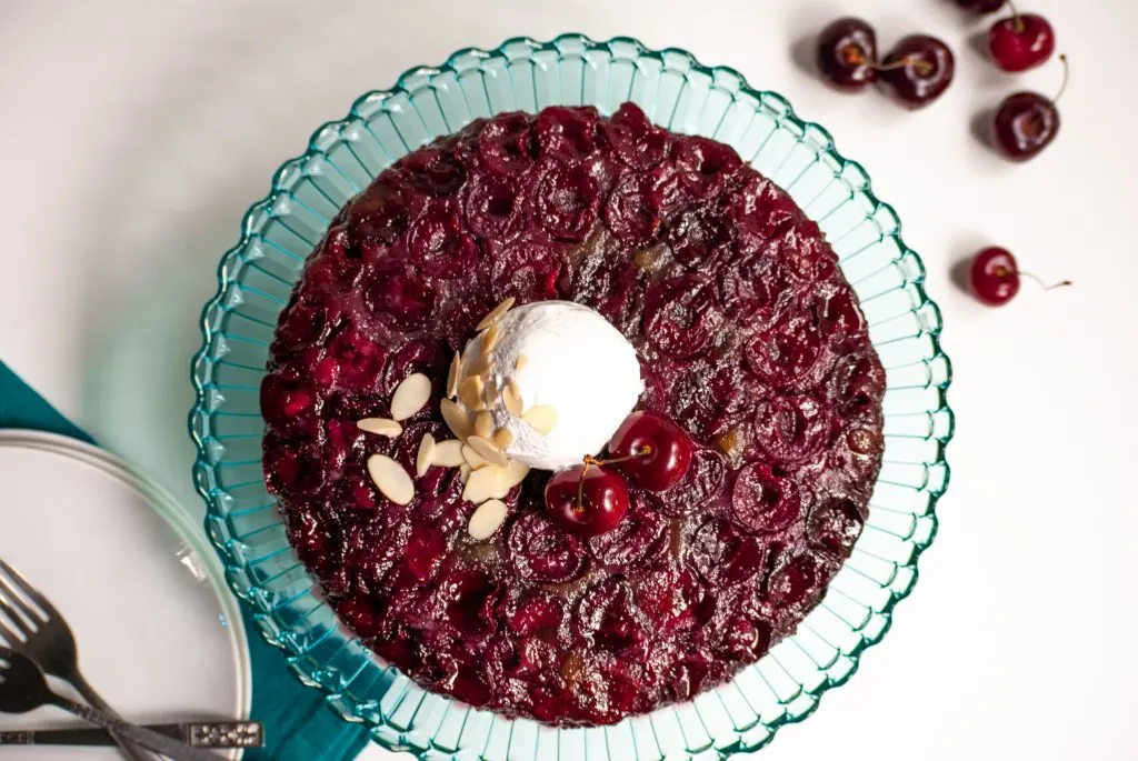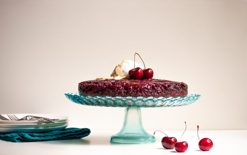This easy to prepare vegan upside down cherry almond cake is the perfect last minute treat to end any meal and fully takes advantage of the summer cherry bounty. The almond cake is baked on top of a layer of cherries and a quick no-fuss caramel so when flipped over, the cake is left with a crown of cherries in a gorgeous light sauce, staining the top and sides of the cake. This cake is best served warm with a scoop of your favorite non-dairy ice cream, coconut whipped topping or yogurt.
